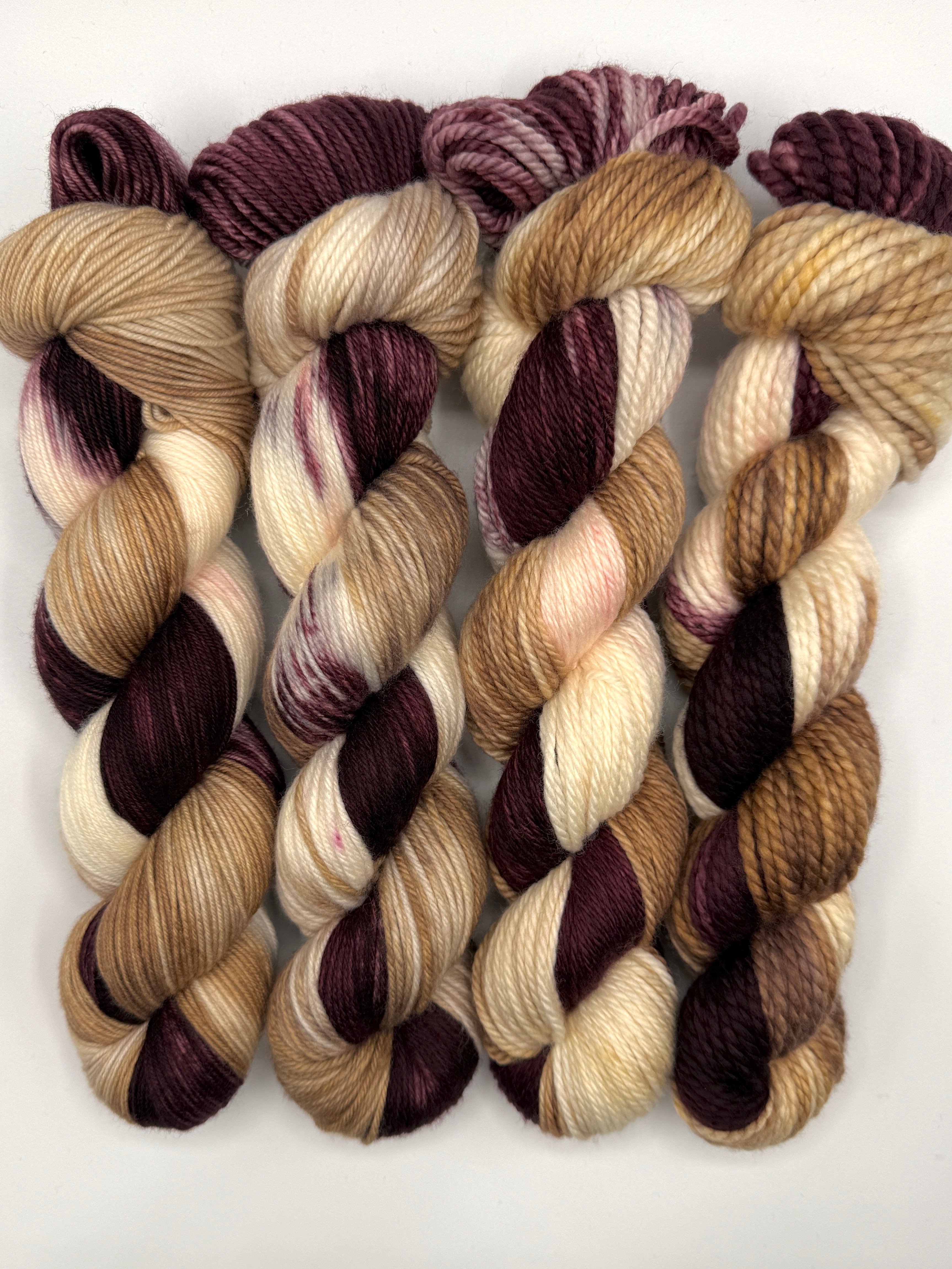 Deep wine and plum tones bloom through the skein like petals carefully kept, rich and velvety without overpowering. Warm parchment, antique gold, and creamy ivory weave between them, creating contrast that feels gentle and lived in. The interplay of light and shadow gives this colourway a naturally striping rhythm, reminiscent of layered pages and the subtle variation of aged paper.