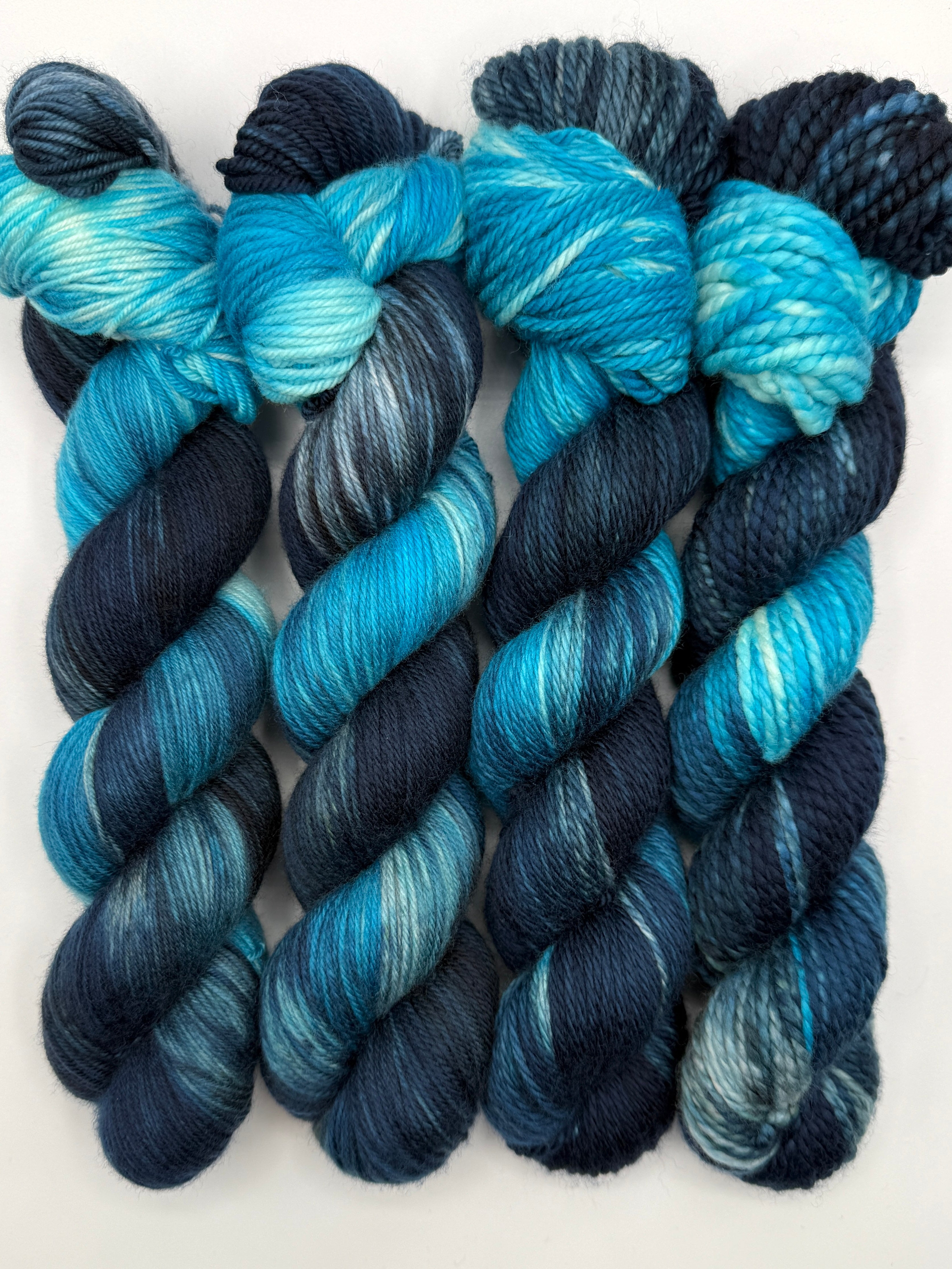 Deep navy anchors the skein, shifting into charcoal and storm-grey as if clouds are rolling across the fiber. Bright turquoise and electric aqua flash through the darkness like fading lightning trails over open water. When worked up, these tones move in rhythmic, wave-like stripes that echo the sea settling back into its own breath.