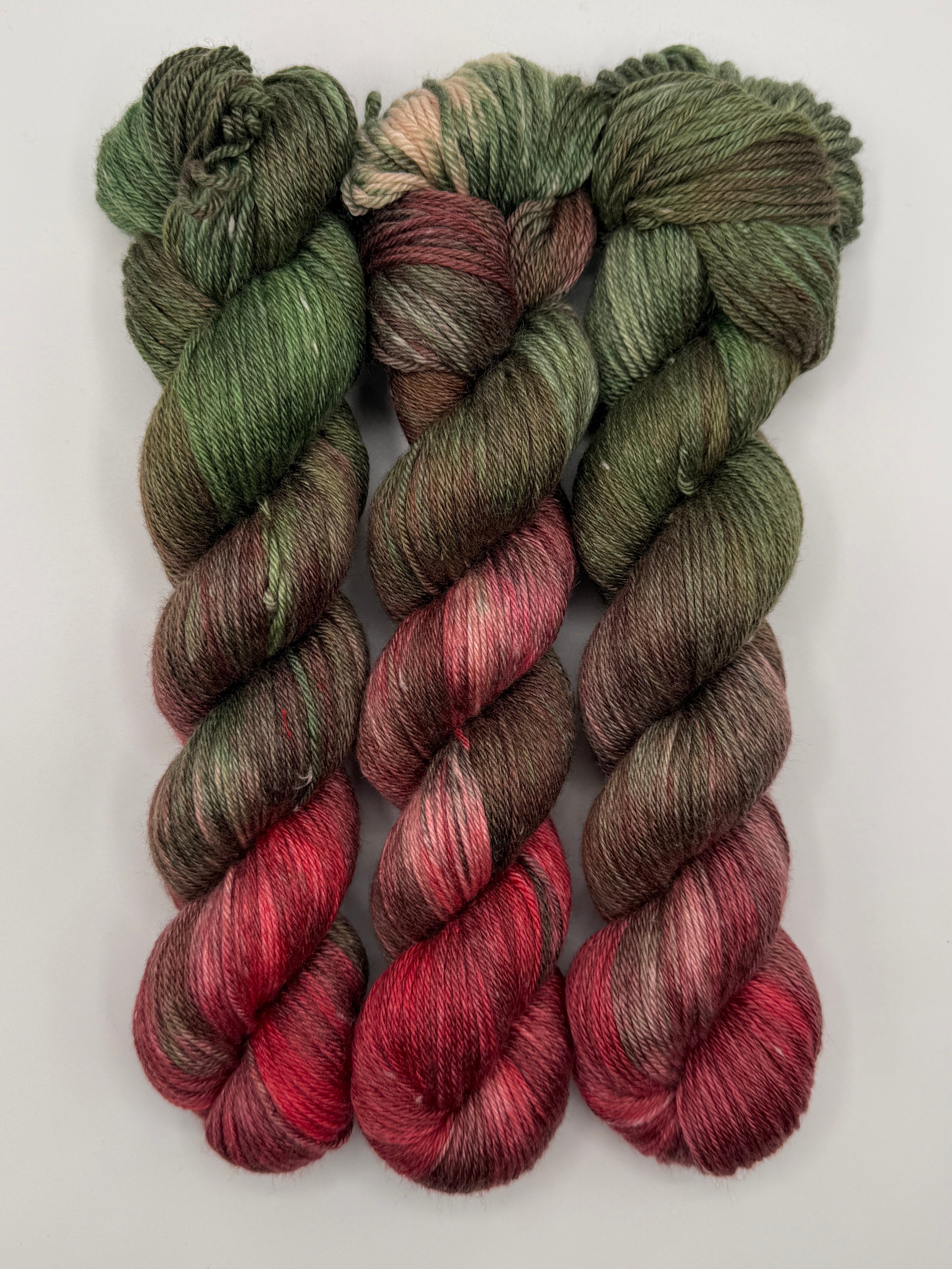 This colorway wanders into a quiet stretch of forest where the season has already turned, and the last bright berries have dropped into the moss. There’s a hush in the air, the kind that follows endings and remembers them tenderly. It’s the soft melancholy of autumn giving in to winter, wrapped in the earthy magic of a place untouched.