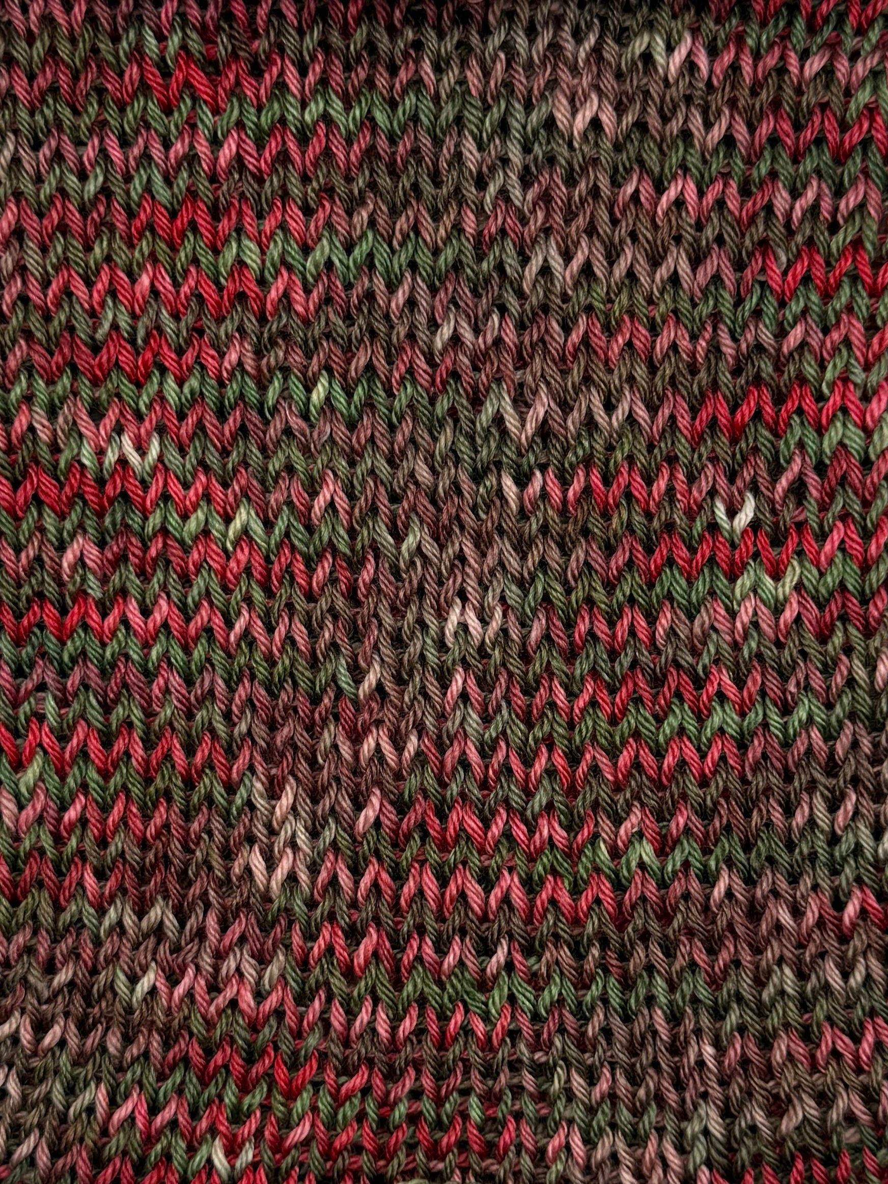 Deep woodland greens form the backdrop, layered with warm, grounded browns that echo bark and soil. Scattered through the skein are reds and dusky rose tones, wildberries fallen to the forest floor, adding small, vivid sparks of color amid the shadows. The palette moves gently between moody, earthy, and quietly enchanted.