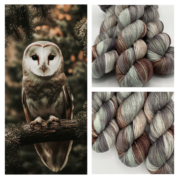 Un mélange terreux de sauge douce et de gris argenté, rehaussé de brun terreux et de reflets d'ambre doré, comme des plumes se déplaçant au clair de lune, des branches se balançant dans l'obscurité et des yeux qui brillent de secrets inconnus.
